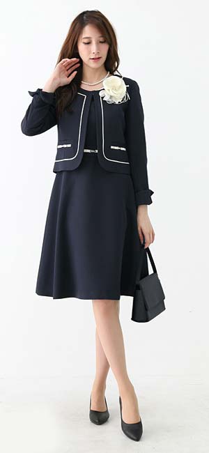 ノーカラージャケット+ワンピースの2点セットのレディーススーツ。