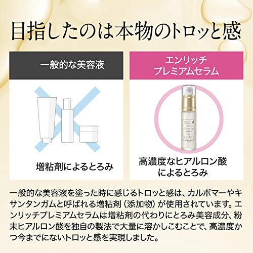 エンリッチプレミアムセラムは増粘剤の代わりにとろみ美容成分、粉末ヒアルロン酸を独自の製法で大量に溶かし込むことで、高濃度かつ今までにないトロッと感を実現しました。