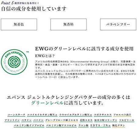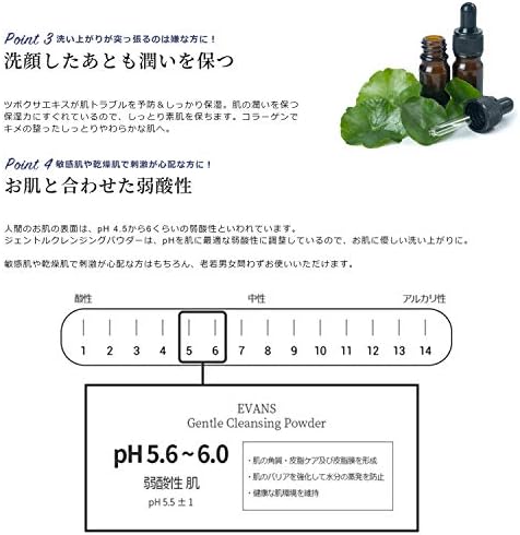 うるおいを守りながら、弱酸性酵素洗顔で優しく汚れを落とす。 EVANS(エバンス) ジェントルクレンジングパウダーは、ツボクサエキスが含有されている酵素洗顔パウダーです。 肌の油やタンパク汚れを浮かせて除去、さらに角質を分解しながら毛穴に入り込み、毛穴の黒ずみまで優しく取り除きます。 また、スッキリ汚れを落としながらも必要な油分は残すしてくれるのでクレンジング後はしっとりした肌を実感できます。 余分な皮脂、黒ずみでお悩みの方、クレンジング後のしっとりした仕上がりがほしい方、クレンジングと洗顔を同時にしたい方、敏感肌でお悩みの方、肌荒れを予防できる洗顔フォームをお探しの方におすすめです。