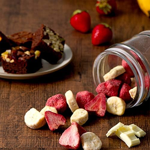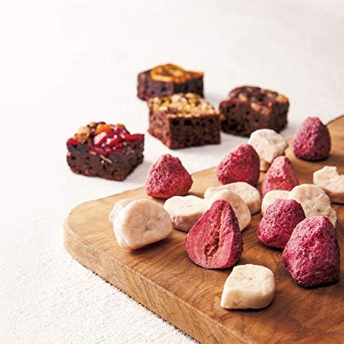 フリーズドライのイチゴやバナナに独自の技術で繊維の中にたっぷりとホワイトチョコレートをしみ込ませた含浸チョコレートと、甘すぎない濃厚なチョコの味わいと、ザクザク刻んだナッツの香ばしさ、ドライフルーツの甘酸っぱさを、ひとくちサイズに焼き上げた果実のブラウニーの詰合せ。