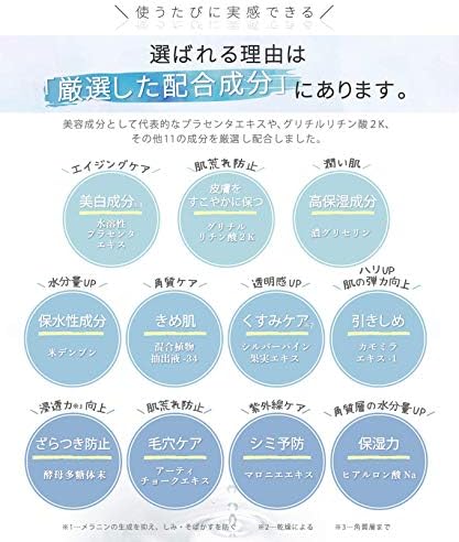 【 医薬部外品 】厚生労働省の基準値を満たしている医薬部外品です。主成分の水溶性プラセンタエキスが老化ダメージを防ぎ、グリチルリチン酸2Kの殺菌効果が炎症を抑え、肌荒れやニキビのケアに効果を発揮します。