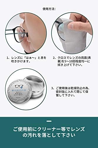 ➤【簡単な使い方】1.傷の原因になるため、使用前にレンズ表面を水洗いし、砂やホコリ等を落としてから乾燥させてください。2.レンズに「はぁ〜」と息を吹きかけます。3.クロスでレンズの両面(表裏)を5〜10回程度均一に拭いて下さい。4.ご使用後は乾燥防止の為、収納缶に入れて閉じて保管して下さい。