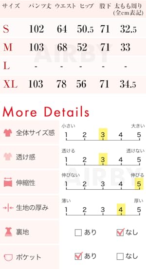 サイズ:パンツ丈/ウエスト/ヒップ/股下/太もも周り(cm)