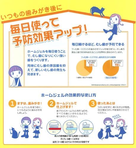 ■こだわりポイント 1.“歯質強化”や“再石灰化”を促進するフッ化第一スズ   スズイオンの殺菌効果でお口の中の細菌を減らします。   歯肉が腫れる原因のひとつが、プラーク中にいるいくつかの細菌。   殺菌効果のあるフッ化第一スズは、むし歯だけでなく、歯周炎予防にもおすすめです。 2.発泡剤無配合   泡立ちを抑えてあるので、吐き出しが少なくてすみます。 3.うがいは不要   歯磨きの後、塗ってそのままお休みできます。 ■ホームジェルの効果的な使い方 1.まずは、歯磨き!   ホームジェルを使う前に、いつものように歯磨きをしましょう。 2.ホームジェルで仕上げます!   歯ブラシにホームジェルをのせ、すべての歯にいきわたるように   軽く磨いてください。   使用量は1回0.5g程度(1日2回使用)。   幼児(3~6歳)はその半分が目安です。 3.ホームジェルを使った後は   うがいはせずに、軽く吐き出す程度。30分間はうがいや飲食をひかえてください。 ■内容量 65g ■使用方法 適宜適量を歯ブラシにとり、歯牙及び口腔内を磨いてください。 ■成分 【基剤】濃グリセリン、水 【溶剤】プロピレングリコール 【着香剤】香料 【粘稠剤】カルボキシビニルポリマー 【薬用成分】フッ化第一スズ 【甘味料】キシリトール 【保存剤】パラベン 【pH調整剤】水酸化ナトリウム ■使用上の注意 ●ご使用中に発疹などの異常が現れた場合は使用を中止し、医師または歯科医師にご相談ください。 ●傷などに直接つけないようにしてください。 ●ご使用後はキャップをしっかりと閉めてください。 ●使用後は必ずキャップをしめ、高温や直射日光を避け、乳幼児の手の届かないところに保管してください。 ●また本剤を別の容器に移し替えないでください。 ●高温や直射日光を避け、乳幼児の手の届かないとろにおいてください。 ■区分 医薬部外品 ■製造国 日本 ■製造販売元 (株)オーラルケア