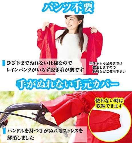 ●【 ひざ下までぬれない 】 マチで足の可動域が広くなり、ひざまでめくれ上がるストレスを解消しました。 ●【 下半身への雨のを防ぐ 】 股下カバーがスネぐらいまでのぬれを防ぎます。 ●【 パンツ不要 】 上下セパレートタイプより圧倒的に脱ぎ着が楽です。 ●【 手が濡れない手元カバー 】 使わないときは収納可能で、ハンドルを持つ手がぬれるのを防ぎます。