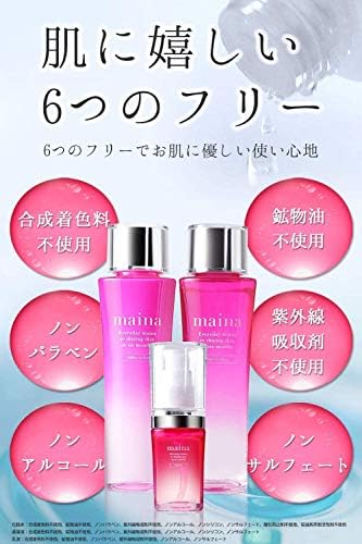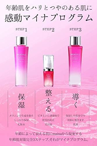 ✅【感動 マイナプログラム】マイナは年齢によって衰える年齢肌に寄り添った3ステップ。マイナプログラムでお使いいただくことで肌本来の潤いに。理想のうるもち肌に導きます。【お知らせ】maina 乳液の香りが『もも』に生まれ変わりました。ももの香りで、あなただけのリラックスタイムを。また、地球で生活する私たちにとって、限られた資源を大切にしたいという思いから、mainaシリーズは一部化粧箱をなくすことになりました。お客様にはご不便をおかけしますが、何卒ご理解いただきますようよろしくお願いいたします。