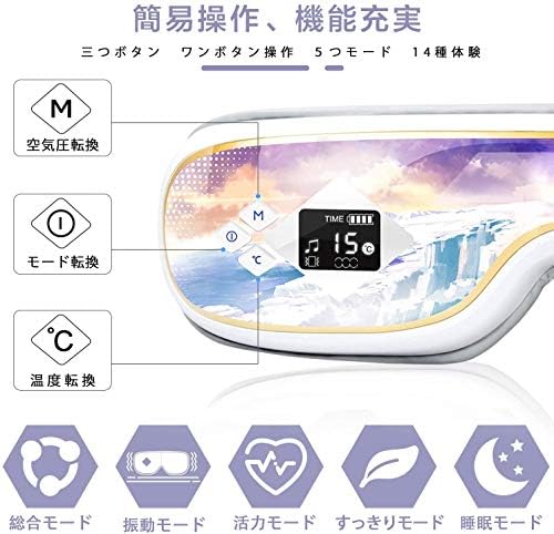 【5Dエアウォーマー】本製品には2種類の空気圧モード切り替えがあります:動感圧力+智能圧力。これらの2つの空気圧モードは、簡単にチェンジができて、自分好きなウォーマーモードでいつでも楽しめます。また、このアイウォーマーには、統合モード、活力モード、すっきりモード、動感モード、および睡眠モードの5つのモードがあります。モードが調節できて、お好みの機能を選択してましょう。