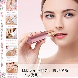 【全身用可能+LEDライトつき】鼻下、わき、ビキニゾーン、背、指、腕、足、口の周り等細かい部分もきれいに除毛。30000RPM /分の回転スピードですばやく、きれいに産毛・ムダ毛を処理できる。なお、ハイスピードステンレス刃を採用し、一度広範囲をカットできるので、あっという間にムダ毛を処理、そり残しも少ない!LEDライトが内蔵されているので細かい部分や暗いところでも見える。