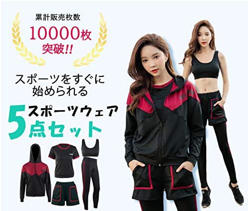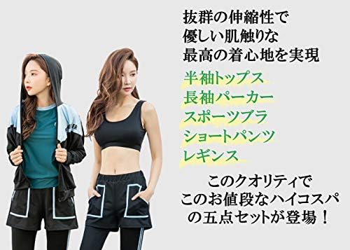 《汗をかいてもサラサラ感が持続》吸汗・速乾性・通気性に優れた素材を使用しているので汗をかいてもサラサラ感が持続♪ 《ハイコスパ》半袖トップス・長袖パーカー・スポーツブラ・ショートパンツ・レギンスの五点セットでこのお値段 《どんな動きにも最適なフィット感》ウェアは全て柔らかい素材柄伸縮性に大変優れているので、快適な着心地でどんな動きにも最適なフィット感! 《周りと差を》デザイン性に優れ、思わずあなたも一目惚れ。ジム等で着れば周りと一歩差を付けれるおしゃれさんに♪ 《ふわふわと優しい肌触り》最高の着心地を実現 《着痩せ美人》横のライン、幅広の短パンにより美脚・美シルエットを実現。ダイエット目的での購入でも着るのが恥ずかしくない!