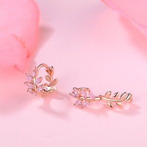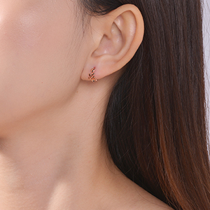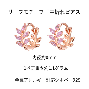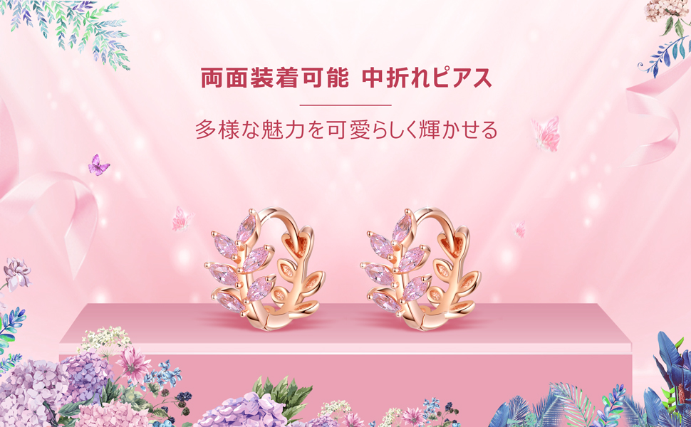 このピアスは正面か反面に装着できます。正面はピンクリーフカットのジルコンが贅沢なラインを形作り、純粋なフェミニンの美しさを外観に添えています。反面は簡単で素敵な地金なので、存在感がありながらも主張しすぎない感です。
