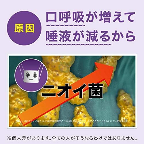 【マスク着用時の口臭ケアに】唾液の分泌が少なくなると、細菌が増殖しやすい環境になり、口臭を発生しやすくなります。口臭の原因:口の中の乾燥・マスク着用による口呼吸・そのほかにもタバコの喫煙・アルコール・ニンニクなど