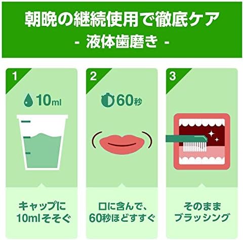 【使用方法】適量を30秒ほど口に含み、ブラッシングしてください。6歳以上~12歳未満の場合は約10mL、12歳以上の場合は約20mL、1日2回の使用をお勧めします。
