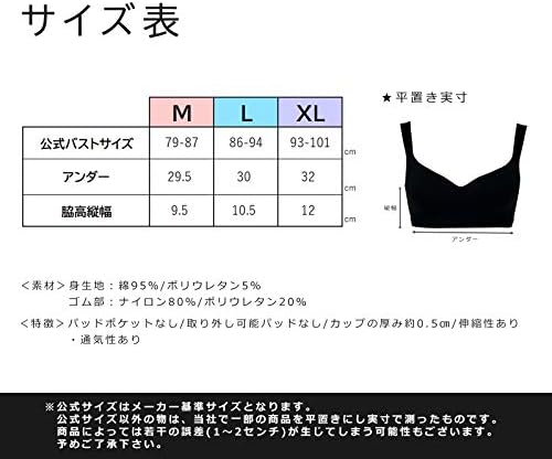 【サイズ】M:アンダー29.5㎝/脇高9.5㎝/公式バスト79-87㎝ L:アンダー30㎝/脇高10.5㎝/公式バスト86-94㎝ XL:アンダー32㎝/脇高12㎝/公式バスト93-101㎝