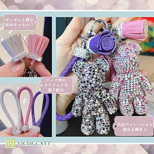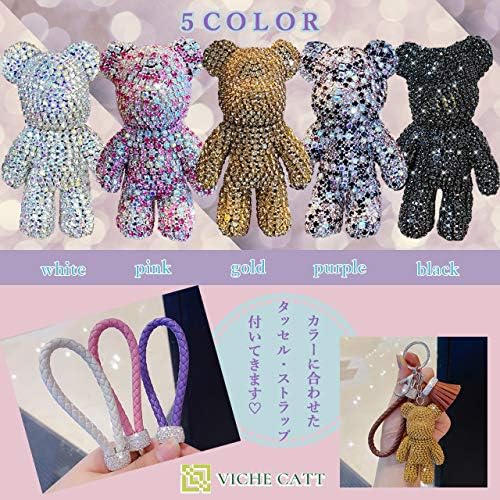 クマのラインストーン部分は強力に接着されているため、はがれにくく、安心してご使用頂けます。 カラーバリエーションはホワイト・ブラック・ピンク・パープル・ゴールドの全5色類ご用意があり、カラーによっては違う色味のストーンをランダムに敷き詰めることで高級感を演出。 ストラップはフープ型で手に持ちやすく、アクセントで付いているタッセルと同色で揃えられていています。持ち運びにも便利なポケットサイズ。 着脱簡単なナスカン、キーリング(鍵の大きさによっては複数個付けることも可能)もちゃんとあるため実用性もバッチリ!