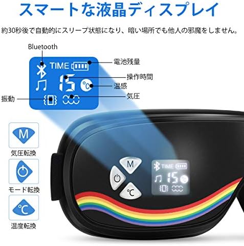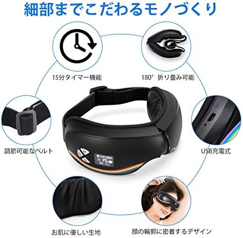 ✿【15分タイマー&Bluetooth音楽機能】 15分にお手軽マッサージ、途中で寝てしまっても安心!ブルートゥース機能付きなので、パソコンやスマホと接続し、好きな音楽を聴きながらリラックスタイムを楽しむことができます。さらに、音量は調節できて、音楽なしの静かに時間でもOKです。通気性よく、放熱しやすくてお肌にも優しい生地で眼部完全包囲に密着デザインされ、自分では出来ない絶妙な圧感を目元やこめかみにかけてくれます。
