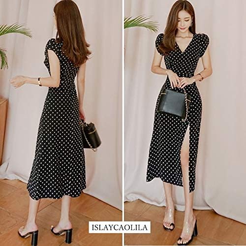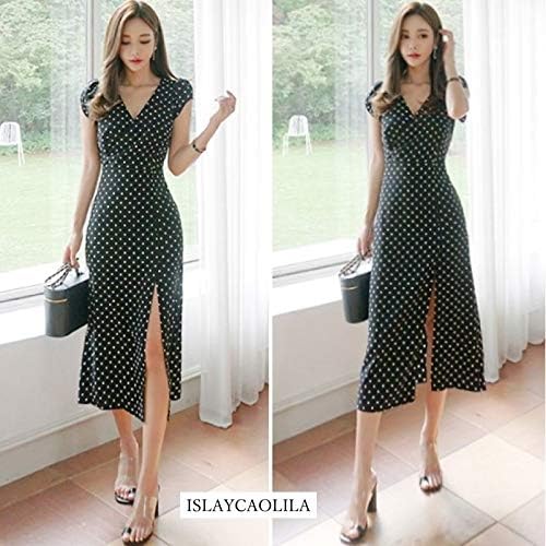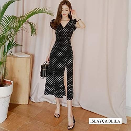 黒地に白の水玉模様はシックで落ち着いた大人の装いになり、スリットからのぞく色気が上品に香ります。