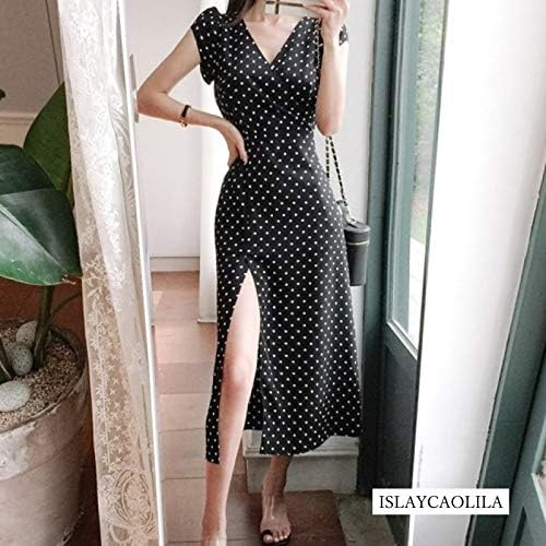 水玉模様がシックに上品で、深いスリットがセクシーなロング ワンピース、パーティドレスです。