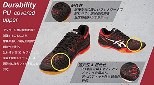 また、アウターソールの接地面積を広げ、横方向の切り返し動作にも対応。アッパーを合成樹脂(PU)で補強することにより、摩耗の激しい前足部内側の耐久性を強化。