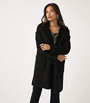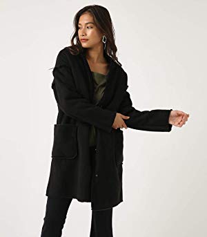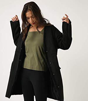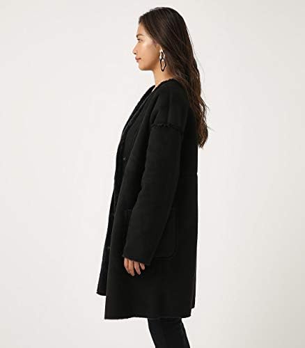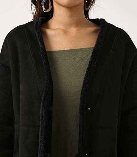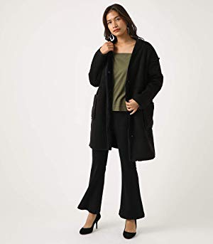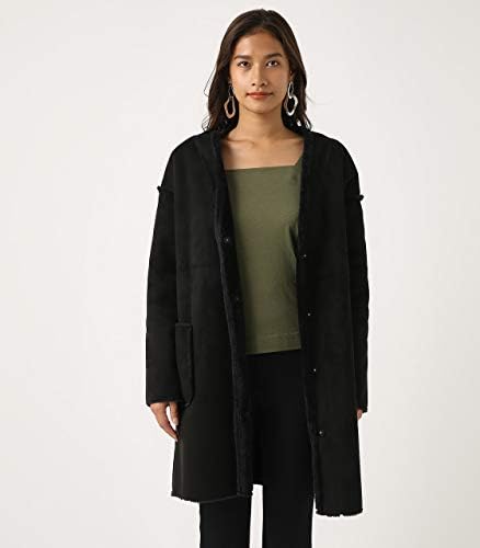 フロントに施された大きなパッチポケットがアクセントを効かせているフェイクムートンコート。フェイス周りをすっきりと見せるノーカラー、ドロップショルダー、高い位置での身頃切り替えなどがポイントになっています。スキニーなどのタイトなシルエットはもちろん、ワイドボトムスとも好相性です。