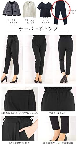 ノーカラージャケットとカラーレスジャケット、ストレッチ性のあるトップス&テーパードパンツがセットになったレディーススーツです。ヒップ回りはゆったりと、裾回りは細めのテーパードシルエットは、美脚効果があるデザイン。このセットだけでコーディネートが完成する手軽さもうれしいポイント。入学式や卒業式・会社行事など、セレモニー全般におすすめです。大きいサイズから小さいサイズまで幅広く展開しています。