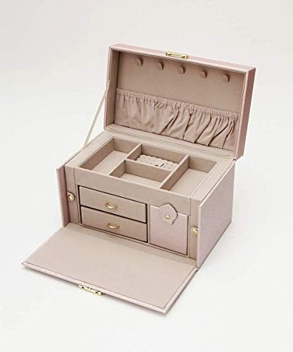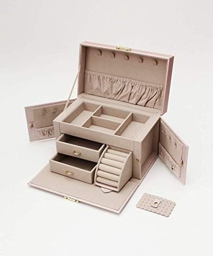 シンプルながらキラキラと角度によって輝くケースデザイン。上フタの内側と両サイドのスナップボタンを開けると、ネックレスが絡まないよう掛けられるフックが計11個とギャザーポケット付き。中は上段にフリースペースが4つとピアスホール24個、下段は左側に2段仕様の引き出しと右側にリングホルダー付き。大振りなアクセサリーから細々としたものも整理できて便利です。ドレッサーが華やぎ、女子気分もアップするアイテム。持ち手付きなので、持ち運びしやすいのも嬉しいポイント。鍵付き。【アイボリー】【ピンク】2色ご用意いたしました。