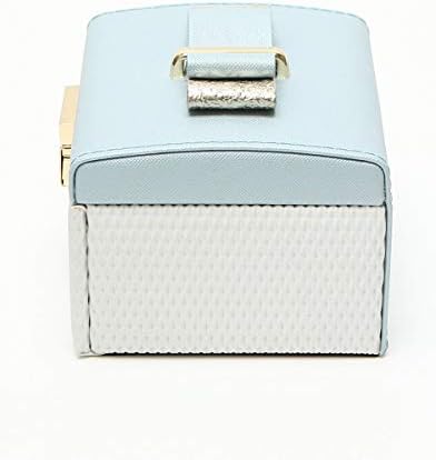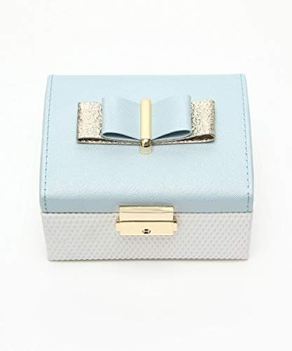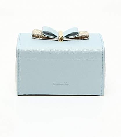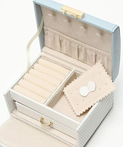 落ち着いたパール調のフェイクレザーと、シャイニーで華やかな素材を組み合わせたジュエリーボックスのMサイズです。フタの上には上品なリボンを飾ったフェミニンなデザイン。中にはリングホルダー、チェーンが絡まらずに収納できるネックレスホルダーが4個、かぶせフタ付きのフリースペースが付いていて機能も充実。かぶせフタにはピアスホルダーが8個付いています。下段はひきだしスペースがあり収納力もたっぷりです。鍵付き。