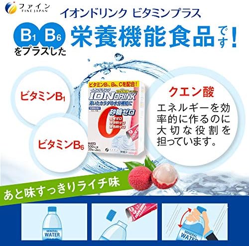 使いやすいスティック状のイオンドリンク(粉末タイプ)です。水に溶かすだけで、500mlのペットボトル22本分使用できます。砂糖・脂質・保存料・着色料ゼロ。ビタミンB1、B6を配合した機能性飲料です。 ビタミンB1、B6をプラスした栄養機能食品です。あと味すっきりライチ味。 【原材料名】難消化性デキストリン(フランス製造)、マルチトール、食塩/クエン酸、塩化K、V.C、甘味料(アセスルファムK、スクラロース)、乳酸Ca、微粒二酸化ケイ素、クエン酸Ca、炭酸Mg、香料、V.B6、V.B1