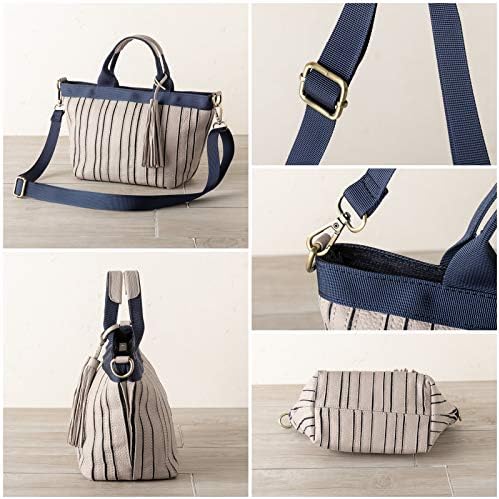 デニム生地に革をたたいたストライプが個性的なトートバッグ。革の間からちらりと見えるデニム生地がユニーク。