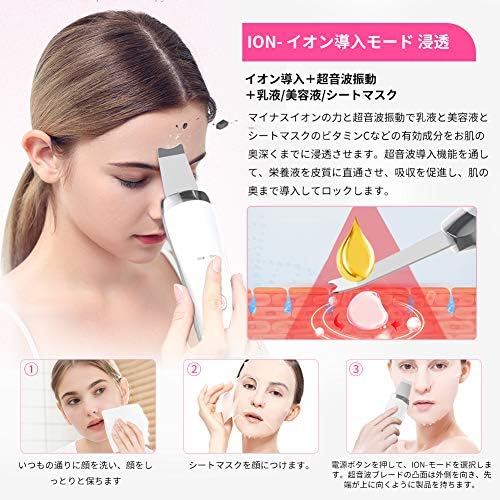 【イオン導出&イオン導入】ION+は、イオン導出モードでメイク落とし化粧水に敵します。イオン導出で普段の洗顔では毛穴深層の汚れがプラスの微電流で吸着し、ウォーターピーリングのピーリングヘッドと超音波振動の力で導出した汚れを吹き飛ばします。ION-は、イオン導入モードで乳液と美容液に適します。マイナスイオンの力と超音波振動で美容液とシートマスクの有効成分をお肌の奥深くまでに浸透させます。