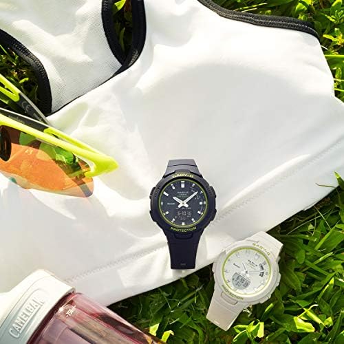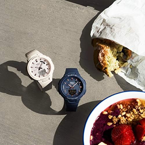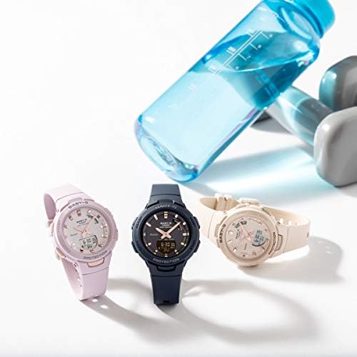 日常の運動やトレーニングを快適にサポートするBABY-Gのスポーツライン「BSA-B100」から、アスレジャーウェアと相性の良い、マットな質感で女性らしいカラーモデルが登場。ベーシックなオールブラック・オールホワイトを始め、ネイビー・ベージュ・ラベンダーカラーには蒸着仕上げを施した華やかなピンクゴールドのインデックスを組み合わせ、スタイル・好みによって選べるデザインです。また、運動時の妨げにならないようケースも薄型化。暗所でのワークアウトにも役立つオートダブルLEDライトも搭載し実用性を備えます。3軸加速度センサーによる歩数計測機能、最大5本×20セットの計測が可能なタイマー、ラップメモリー最大200本、一定時間の間に歩数が少ないとお知らせするステップリマインダー機能など、日常の健康管理やスポーツ時に役立つ機能を搭載。また、BABY-G 初となる、スマートフォンリンク機能が搭載され、Bluetooth 通信による専用アプリケーション「BABY-G Connected」との連携で、日々の活動記録管理や運動設定がスマートフォン側からの簡単操作で実現しました。カロリー算出や目標歩数設定、更にタイマーメニュー作成+ 転送、5段階運動強度付歩数ログ、ストップウオッチ計測データ保管、カレンダーでのデータ一括確認などが可能です。アプリ連携により、自動時刻修正など時計本来の機能も追求しています。女性のアクティブで健康的な日常を、役立つ機能と爽やかなデザインで応援するBABY-Gの登場です。こちらの色はベージュになります。