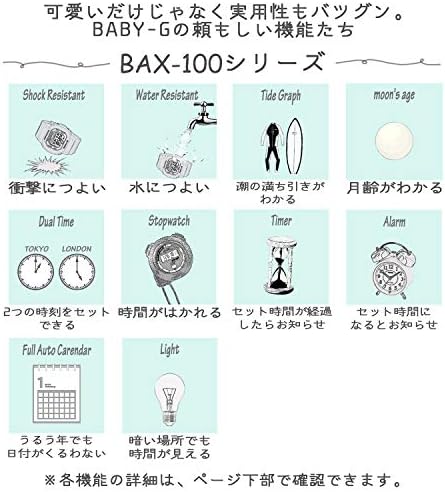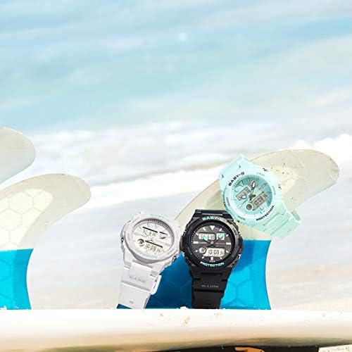 BABY-Gのタイドグラフ機能付きスポーツラインG-LIDEから、サーフシーンを始めカジュアルファッションにも合わせやすいモデルが登場します。アナログ・デジタルコンビの薄型モデル、BAX-100が新たに登場。90sサーフカルチャーをコンセプトに、90年代のG-SHOCKライクなフォルムを採用。サーフシーンで流行のレトロなデザインです。全面をミントグリーンでカラーリングしたビーチシーンにぴったりなモデルを始め、ブラック・ホワイトのモデルにもミントグリーンを差し色にした、爽やかなラインアップです。時刻表示モードの時でも、常に潮汐情報を表示。更に4時位置のボタンを押すだけで、その後1時間ごとの潮汐の様子を確認でき、シーンに合わせて簡単に潮の情報を把握できます。インデックスには視認性の高いマリンデザインを採用し海を感じる風合いに。ビーチファッション・カジュアルコーデを彩る、BABY-G の登場です。こちらはBAX-100のホワイト色モデルです。