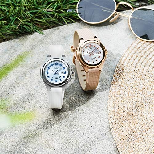 アクティブで洗練された女性のためのBABY-G G-MSから、夏の日差しに映えるモデルが登場します。ベースモデルは、華奢な手元にも合わせやすい小型ケースに、電波ソーラーや3針+日付表示等、日常で便利な機能を搭載したMSG-W300。今回のモデルはミラー加工を施したベゼルと、スタッズをモチーフに多面カットを施したインデックスがキラキラと輝く、華やかなデザイン。夏のビーチリゾートに映えるエレガントな手元を演出します。 バンドは、さわやかなホワイトや、海の砂浜をイメージしたライトブラウン・ベージュのサンドカラーでカラーリング。バンド素材には肌触りの良い樹脂を採用し、夏も快適に着用できます。アクティブシーンで役立つ機能はそのままに、日常のタウンユースからリゾートスタイルまで様々なシーンで活躍する、新しいG-MS の登場です。