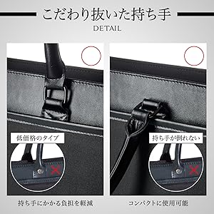 持ち手を折りたためるようにすることにより、持ち手にかかる負担を軽減。また持ち手が倒れることにより電車の中で座ってる時にコンパクトに収納。