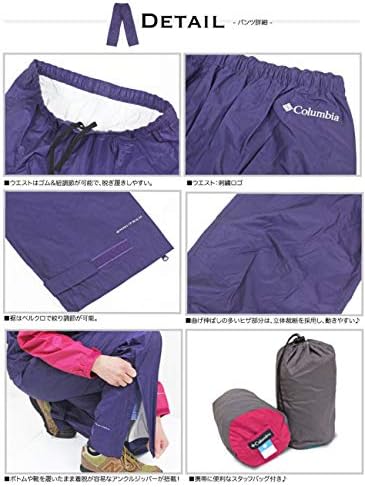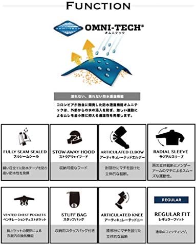 オムニテックによる2.5レイヤー(2.5層)の防水透湿素材/耐久撥水加工/左右首元のドローコードと後頭部のベルクロで頭にフィットするフード/襟にフード収納可能/ベンチレーションを兼ねた内側メッシュの左右ポケット/袖口のフィット感を調節するベルクロ/冷気の侵入を防ぐ左右裾のドローコード/運動性を考慮した肩、肘、膝の立体裁断/ウエストに調節紐/脱ぎ履きしやすい裾のサイドファスナー/足首を調節できるベルクロ/スタッフバッグ付き