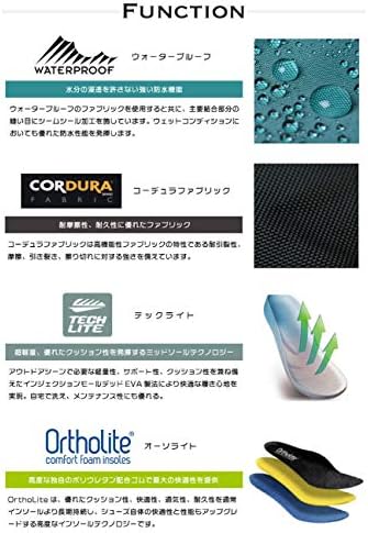 防水設計/耐摩耗性、耐久性に優れた丈夫なコーヂュラ素材/アキレス腱部分の靴擦れを防止するクッション構造の履き口/無数の孔が空いたインソールにより高いクッション性と蒸れを放出する高い通気性を発揮/軽量でクッション性の高いテックライトミッドソール兼アウトソール/歩行の負荷がかかる母指球とかかとにはラバーソールを配置