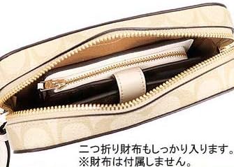 仕様間口:ファスナー開閉 内部:オープンポケット×1 カードポケット×2 背面:オープンポケット×1 ショルダーストラップ:長さ調節可能 ●コーチの二つ折り財布が入ります