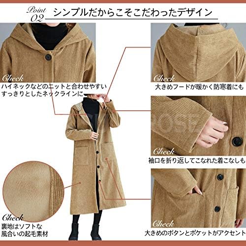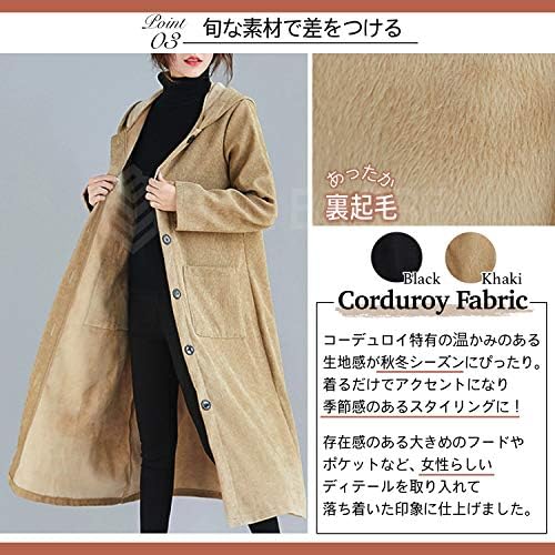 【Fabric】重たすぎず柔らかなコーデュロイ素材で、包まれるような優しい着心地です。裏地はソフトな風合いの起毛素材を使用しており、大きめのフード付きで防寒着にもなる一枚。秋冬シーズンを暖かく過ごせるレディースコートです。