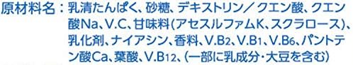 原材料:乳清たんぱく、砂糖、デキストリン、クエン酸、クエン酸Na、V.C、甘味料(アセスルファムK、スクラロース)、乳化剤(大豆を含む)、ナイアシン、香料、V.B2、V.B1、V.B6、パントテン酸Ca、葉酸、V.B12