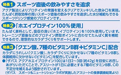 ●商品説明:「ザバスアクアホエイプロテイン100グレープフルーツ風味」は、アクア製法によりプロテインの常識を変えるクリアでスッキリした飲み口を実現。たんぱく摂取効率の高いスポーツ直後の飲みやすさを追求した水分補給もできるスポーツドリンク感覚のプロテインです。・カラダにうれしい「クエン酸」、カラダづくりに欠かせない「7種類のビタミンB群」、体調維持に欠かせない「ビタミンC」を配合しています。・「ザバスアクアホエイプロテイン100」は1日2回~3回(約42g)を目安にお召し上がりいただくことで、アスリートが1日に必要とする7種類のビタミンB群、Cの不足分が補えるよう設計されています。・1袋:840g(約40食分)●お召し上がり方(1食分):水300~500mlに付属のスプーン2~3杯(約14~21g)を溶かしてお飲みください。量は、お好みに応じて調整してださい。運動後がおすすめです。商品につきまして問題がございましたら、お手数ですが下記までご連絡いただきますようお願いいたします。「株式会社 明治 お客様相談センター」 フリーダイヤル: 0120-858-660受付時間:9:00~17:00(土日祝日、年末年始除く)