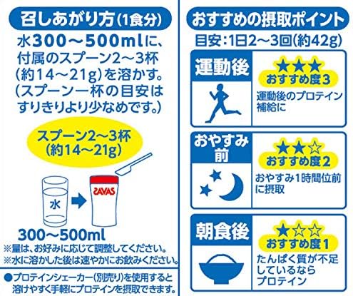 使用方法:水300~500mlに付属のスプーン2~3杯(約14~21g)を溶かしてお召し上がりください。運動後、就寝前、朝食後がおすすめです。※量は、お好みに応じて調整してください。※水に溶かした後は速やかにお飲みください。※プロテインシェイカー(別売り)を使用すると溶けやすく手軽にプロテインを摂取できます。