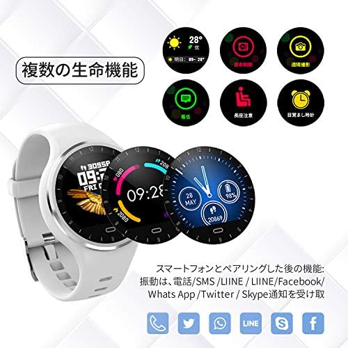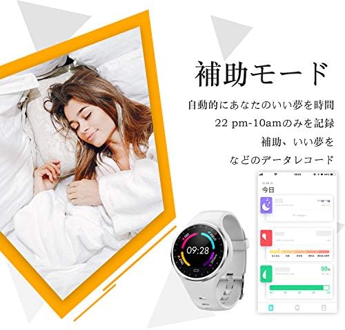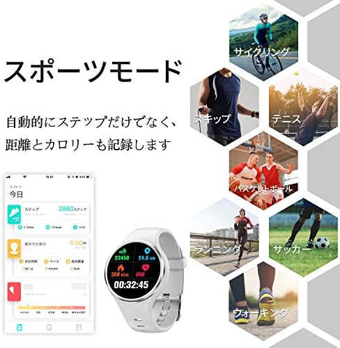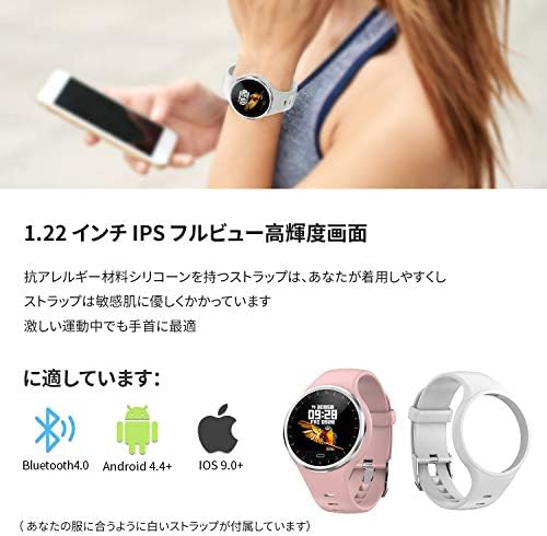 [互換性のあるモデル]ルートゥース4.0以降、IOS 9.0、アンドロイド4.4以降をサポートするスマートフォンのために利用可能です。1.22インチIPSカラーHDディスプレイ。時計のシンプルで洗練されたデザインで、抗アレルギー材料で作られたオリジナルデザインで、敏感肌にやさしく取り付けられており、激しい運動中でも手首に最適です。ホワイトのストラップが付き、洋服との相性がより良いになります。