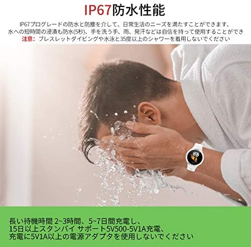 [IP67定格防水性能]手洗い、雨、汗など短時間水に浸しても、日常生活の防水性に対応できる専門のIP67定格認定を取得し、安全にご利用いただけます。ただし、35°Cを超えるダイビングやシャワーは、長いスタンバイ時間、2時間の充電、使用時間の5〜7日、スタンバイ時間の20日間は避けてください。(注:このスマートウォッチは高速充電をサポートしていませんので、5V1A充電器を使用してください