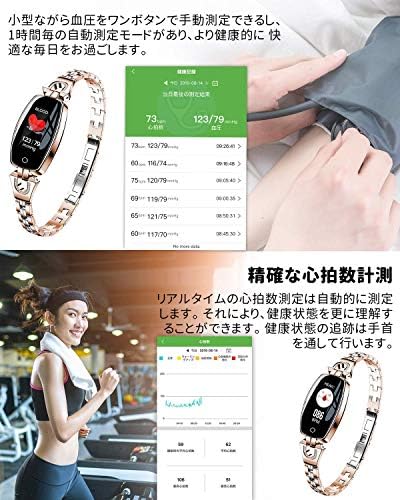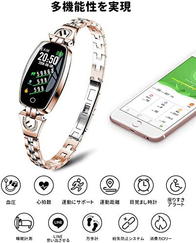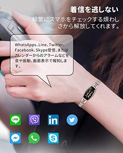 「多機能&スタイリッシュなスマートブレスレット」このスマートウォッチはレディースに向けって,フルカラースクリーン、ならびに金属製バントおよび金属製ケース、特選ジュエルを採用されます。多機能:豊富な機能があなたのために働くのを待つことができません – 24時間実際の歩数計、睡眠モニター、血圧、心拍数、SMSとソーシャルメッセージコール、アラーム、リモートカメラコントロール、座りがちなリマインダー、日付と時刻、アンチロストアラーム、座りがちな思い出させる、手首センサーを同期させます。