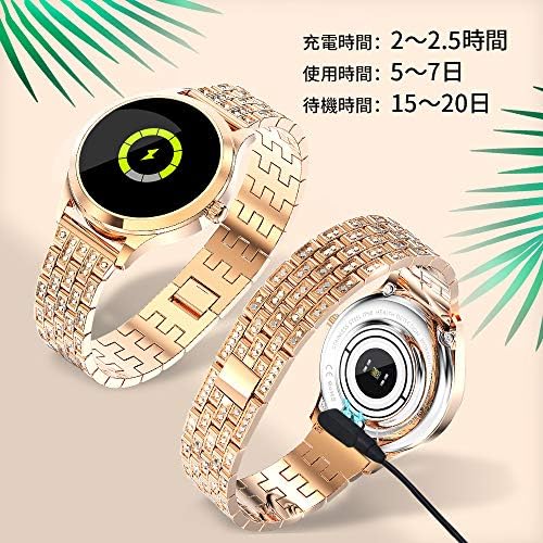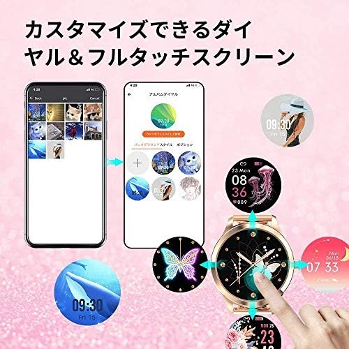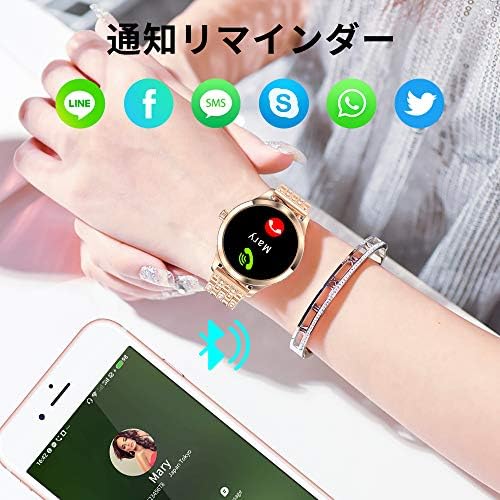 フルタッチスクリーン&カスタマイズできるダイヤル:スマートフォンの写真をスマートウォッチの文字盤に設定することができます。それにアプリには24種類の文字盤があっていつでもダウンロードできます。ダイヤルを優しくスライドさせるだけで、スマートウォッチは必要に応じてインターフェイスを自由に切り替えることができます。操作はシンプルでスムーズです。1.1インチの画面は、女性に適しています。オールスチールのストラップと宝石の組合せにより、レディーススマートウォッチをより豪華にしています。個人の魅力を完全に現します。着用者の気質を高めます。スマートウォッチには日本語の取扱説明書が付いているので、使えないなどの心配はなし。