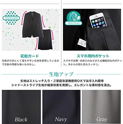 【サイズ】7号、9号、11号、13号、15号、17号、19号 【カラー】ブラック、ネイビー、グレー 【素材】表地:ポリエステル95% ポリウレタン:5% 裏地:ポリエステル100% 【縫製】中国製 ※写真の女性は165cm(着用サイズ9号) ※画像のバッグや小物類は付属致しません。
