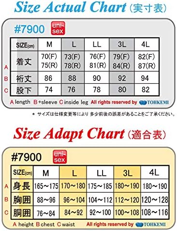サイズ:・Mサイズ:身長165-175、チェスト88-96、ウエスト76-84   ・Lサイズ:身長170-180、チェスト96-104、ウエスト84-92   ・LLサイズ:身長175-185、チェスト104-112、ウエスト92-100   ・3Lサイズ:身長180-190、チェスト112-120、ウエスト100-108