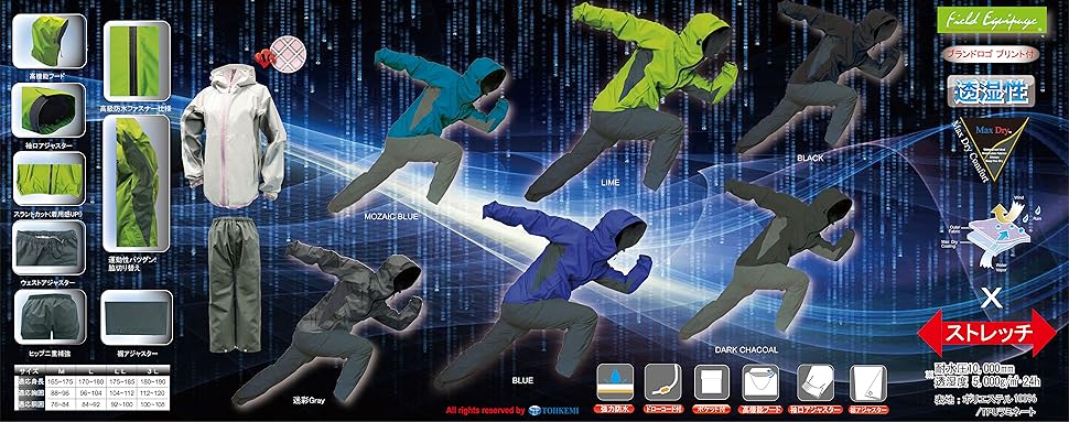 トオケミ(TOHKEMI) 【Field Equipage】 全天候型 アウトドア(透湿レイン) ウェア FE ストレッチ (スリムフィット) Rain Suit (#7900) + キャリーポーチ セット (色選択可能)