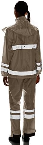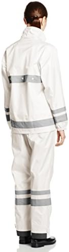 胸・背中・腕・膝・裾に再帰反射テープを装備した視認性の良い女性用レインスーツ。クリアメガネ付きヘルメット対応フード付き。摩擦に強い生地を使用し、地面にすれやすい部分を補強しました。裾ファスナーにより靴を履いたまま着脱が可能。