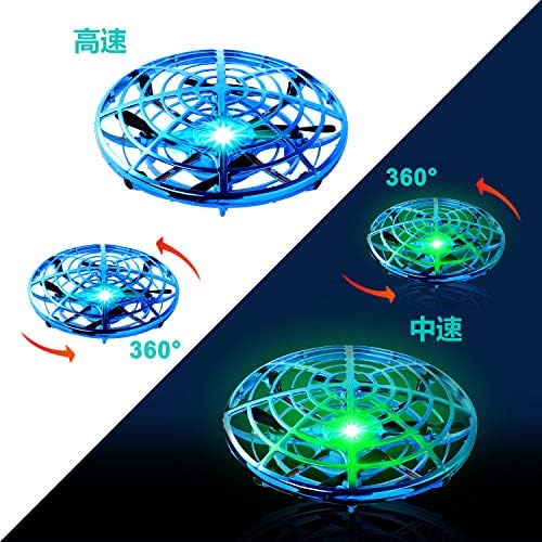 ✈2つの飛行速度と3つのライト✈ボタンを押すことでUFOドローンをオンにして速度モードを調整できます。緑ライト:準備完了と中速、青ライト:高速、赤ライト:バッテリー切れ、充電する必要があります。クールなLEDライトにより、この手動ドローンは夜間に明るくカラフルになります。