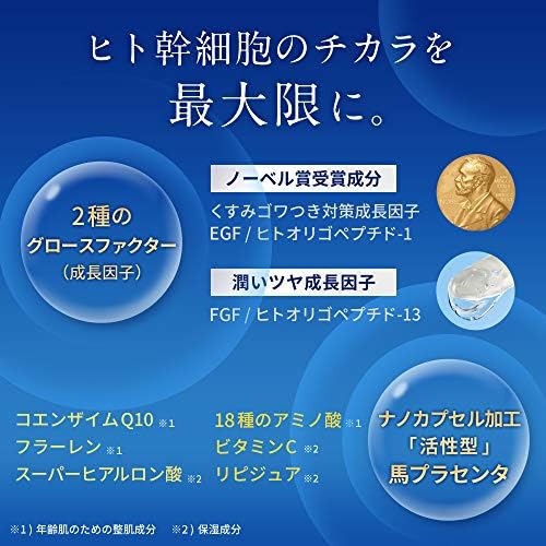 ✅今、大注目!美容皮膚科医も太鼓判の高純度ヒト幹細胞培養液を厳選配合。最先端医療から生まれた次世代スキンケアを体感して下さい。ヒト幹細胞のチカラを最大限にするため、EGF、FGF、ナノカプセル加工馬プラセンタを贅沢に配合しています。